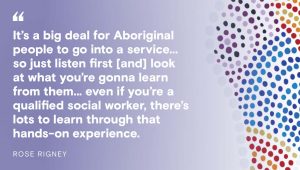 In this episode, Clyde and Rose reflect on their personal and communities’ experiences of contact with mainstream services and practitioners, including some that have been helpful, and some that have not. They share examples of organisations and practitioners that have created relationships with Aboriginal and Torres Strait Islander families and communities, and the skills and knowledge that is needed to engage with rural and remote communities.
