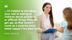 Taking care to describe things in ways that make sense to the child and inviting them to share their understanding of why you’re meeting with them can make a big difference. These practices can enable children to contribute to the conversation and participate fully in your work together. They can also potentially ‘open the door’ to a conversation with the child about the problem they’re facing.